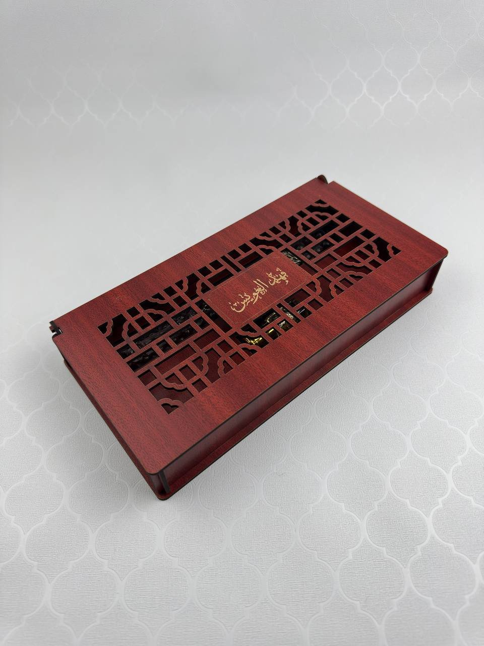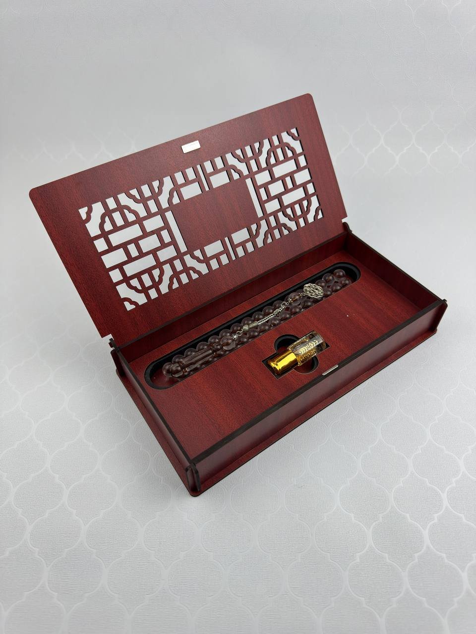 بوكس امجاد خشبي، بوكس هدايا، هدايا فاخرة، توزيعات للمناسبات، سبحة، دهن عود، ربع تولة عود، هدية فاخرة